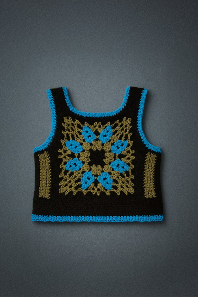 Shop RestyledHandcrafted and utterly unique, this vintage crochet top is a true testament to artisan skill. With its vibrant green and blue floral motif on a classic black background, this piece is both playful and chic. Its cropped fit flatters the waistline, while the stretchy, open-weave design ensures it hugs in all the right places.