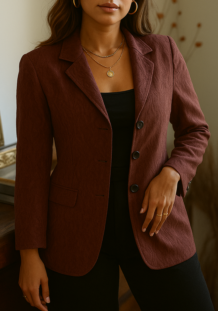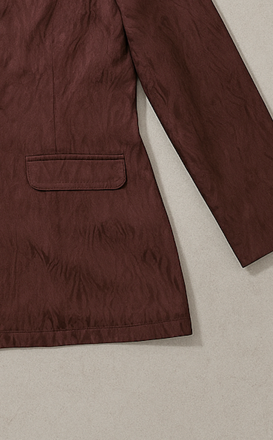 BriBea vintageA richly detailed longline blazer in a deep brown tone. This vintage piece features a unique moiré-like textured pattern that subtly catches light and movement. It's so light. The design includes a notched lapel collar, two flap pockets, and a three-button front closure with dark buttons. The silhouette is lightly tailored and fully lined, offering both structure and comfort. A refined and artistic layering piece with a timeless 90s feel.